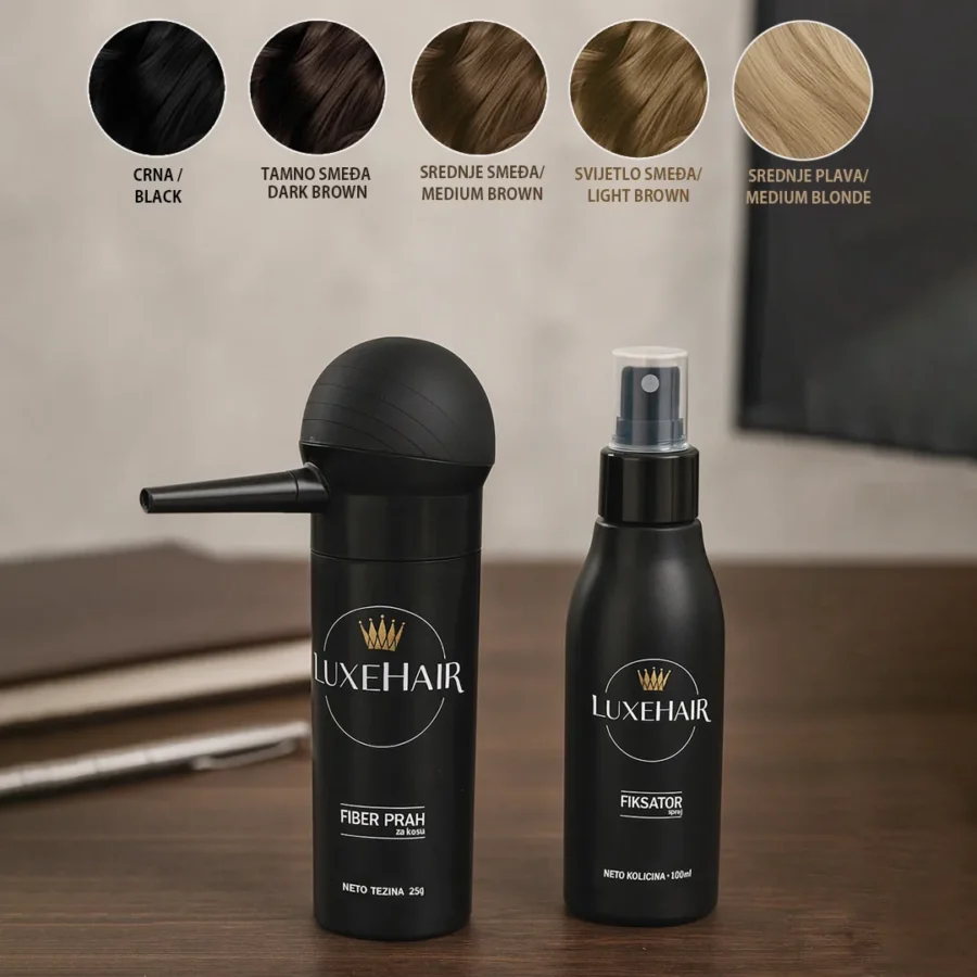 Fiber prah (25 g) za trenutno vizualno popunjavanje prorijeđenih područja + Fiber fiksator (100 ml) koji stabilizira vlakna i sprječava preslikavanje na odjeću.